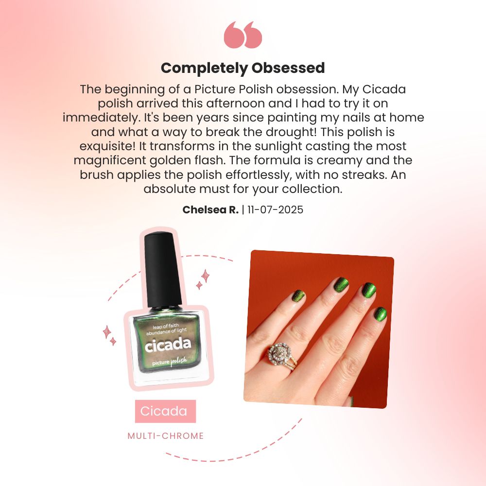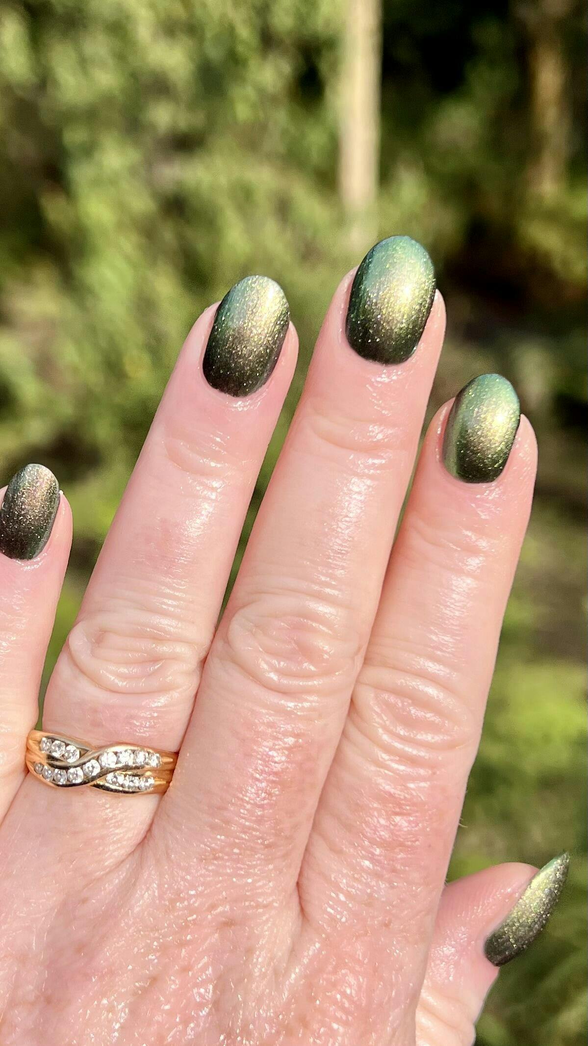 This formula is popular for its colour-changing effect, starting as shiny pewter and shifting with light. This green multi-chrome polish looks stunning alone or in designs, guaranteed to attract attention.