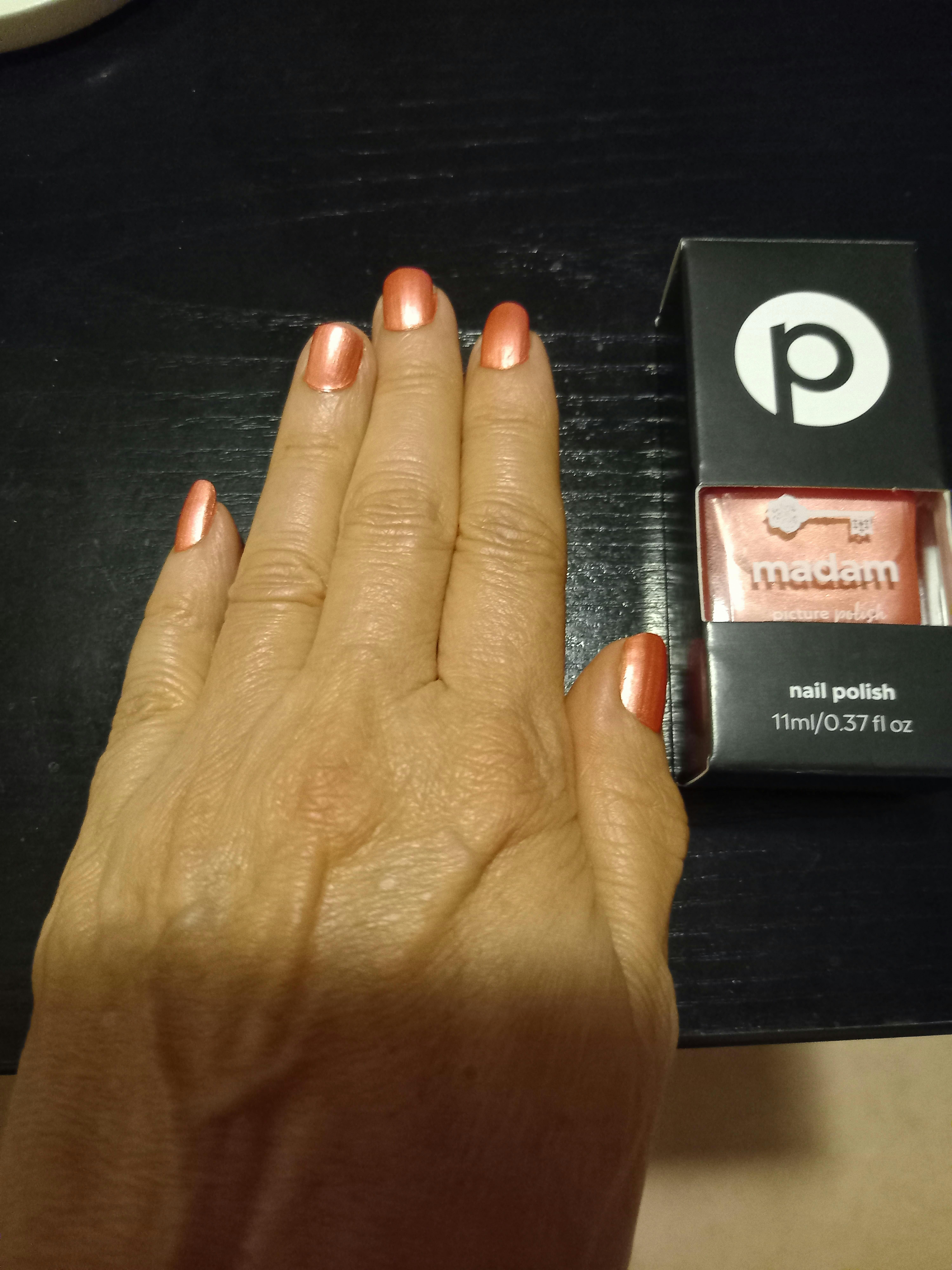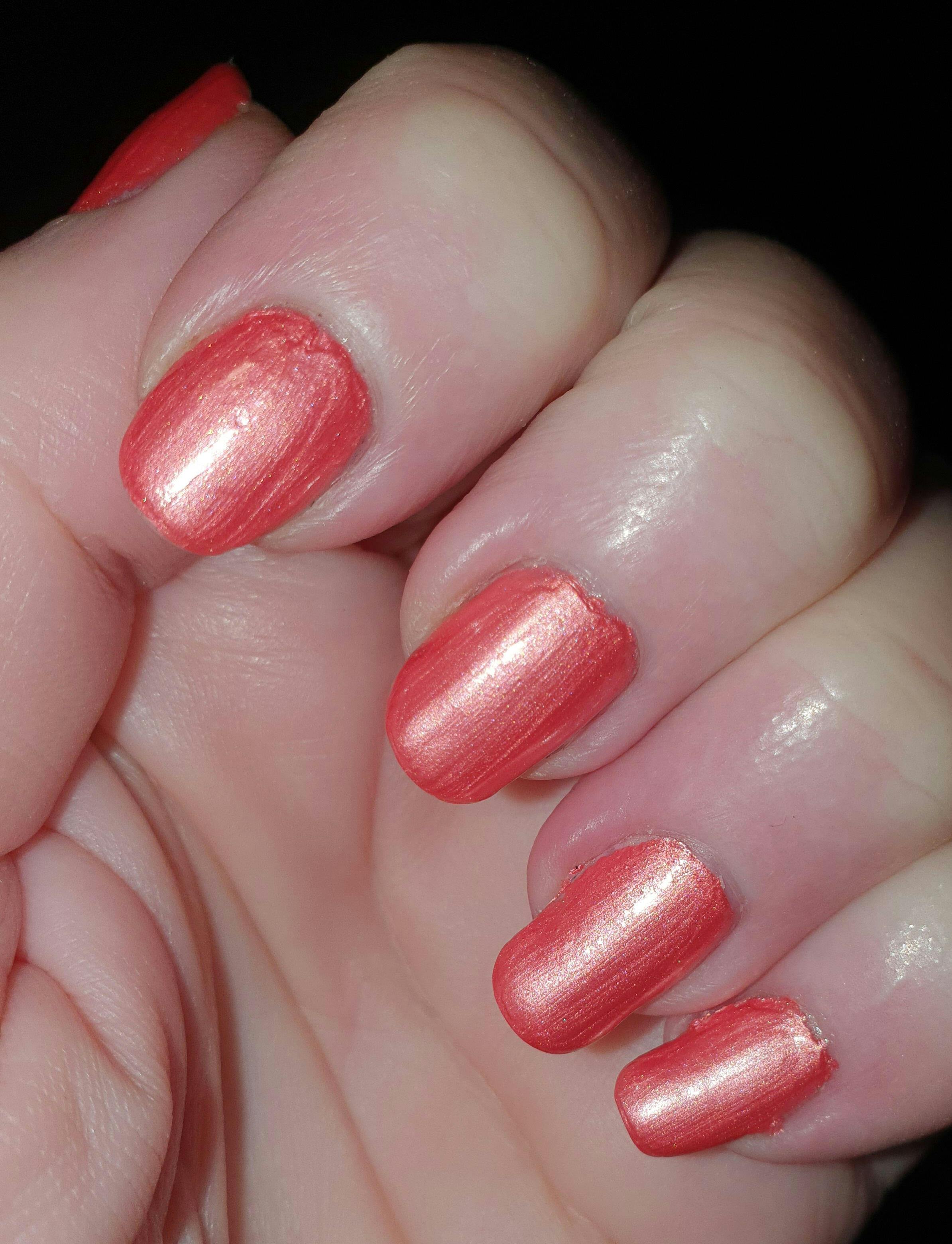 For nails with a sophisticated shimmer, feast your eyes upon Madam nail polish. This bright coral pearl nail polish leans between pink and orange, depending on the light, and always looks gorgeous!