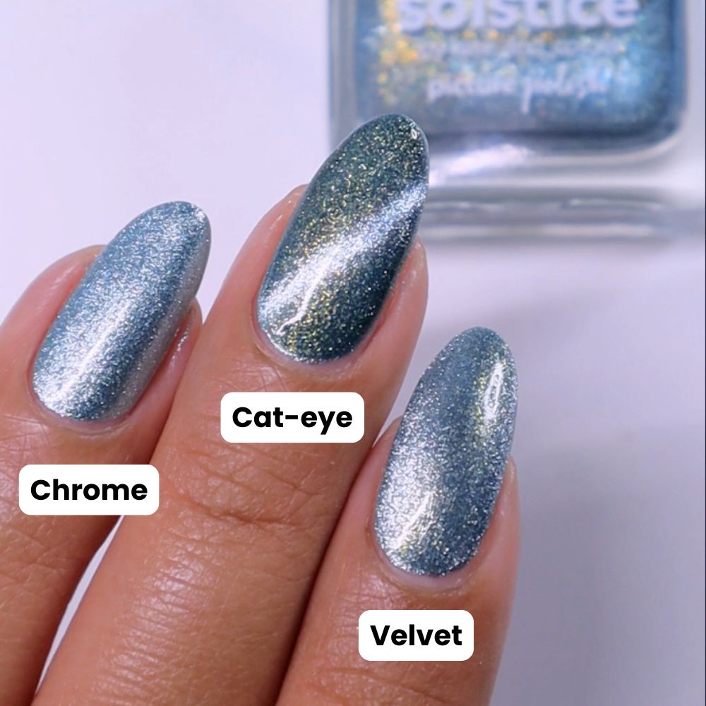 A stunning silver teal magnetic polish that offers three versatile looks!